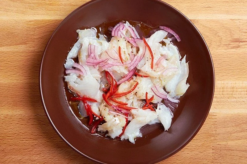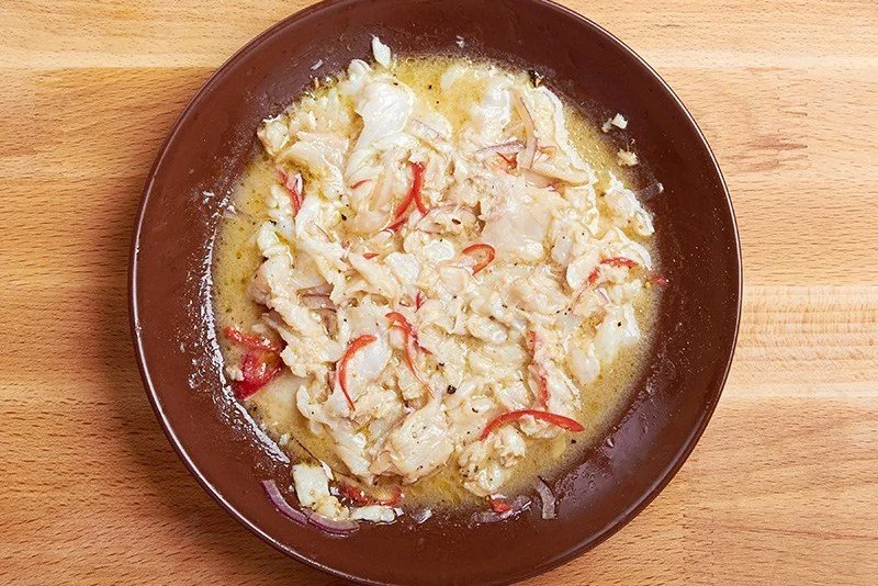 ШАГ 2 Выдавите сок из лайма и лимона на треску, добавьте оливковое масло, посолите, поперчите. По желанию, добавьте немного сахара — это расширит вкус блюда, задействовав больше вкусовых рецепторов.