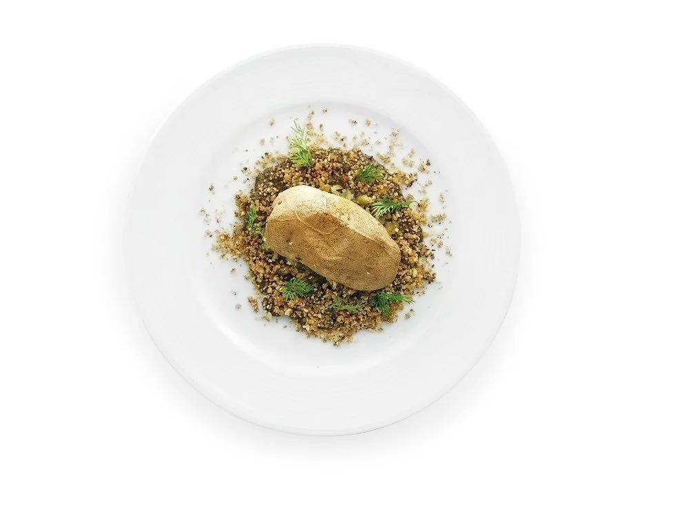 ШАГ 3 Картофель запекать при 140 градусах около полутора часов. Извлечь мякоть ложкой, проделав небольшое отверстие в боку. Размять в пюре, добавить тушеный порей, соль, перец и цедру. Наполнить смесью кожицу. В центр тарелки налить соус, положить огурец и репчатый лук, нарезанные кубиком, крошку из хлеба и грибов, на них — картофель и укроп.