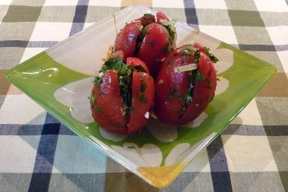 ШАГ 5 Полученной смесью густо намазать срезы помидоров. Затем уложить помидоры в эмалированную кастрюлю. Плотно закрыть крышкой и поставить в холодильник. Через сутки помидоры можно подавать на стол.