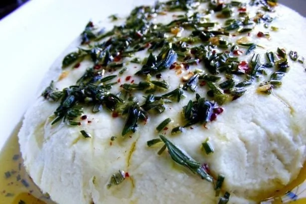 ШАГ 5 На среднем огне довести до кипения 1/4 стакана оливкового масла и зелень. Остудить до комнатной температуры и полученной смесью полить приготовленный сыр.