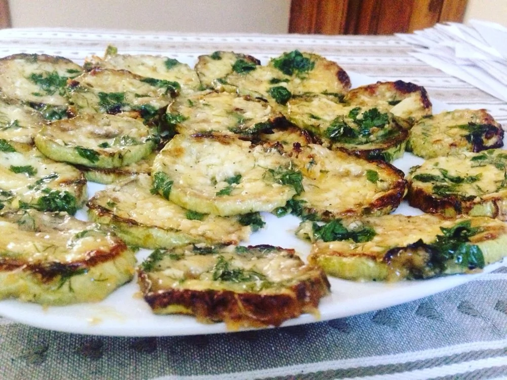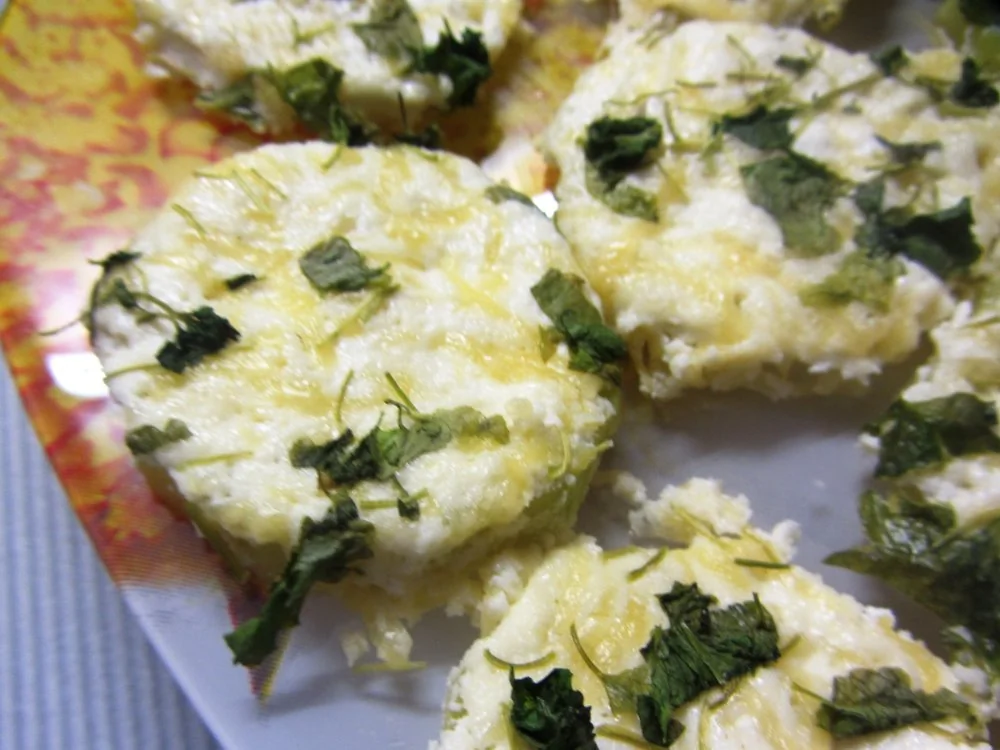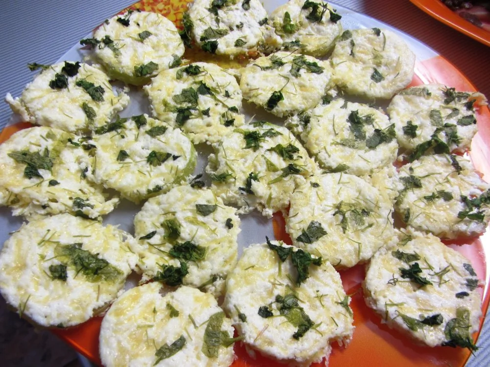 ШАГ 2 Кабачки уложить на противень. В сметану добавить измельченный чеснок и сыр. На каждый кружочек кабачка выложить сметанную смесь, сверху посыпать измельченной зеленью.