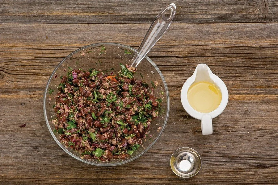 ШАГ 5 Переложите фасоль в миску, добавьте орехи, чеснок, чили перец и уксус, посолите, поперчите, перемешайте.