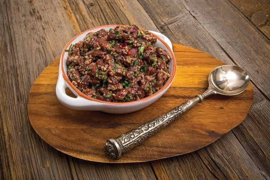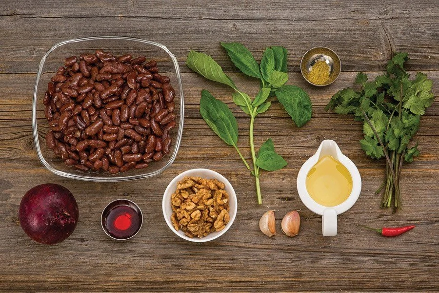 Фасоль Грецкие орехи Красный лук Чеснок Кинза Красный винный уксус Перец чили Хмели-сунели Базилик Подсолнечное масло Закуски Грузинская кухня Лобио