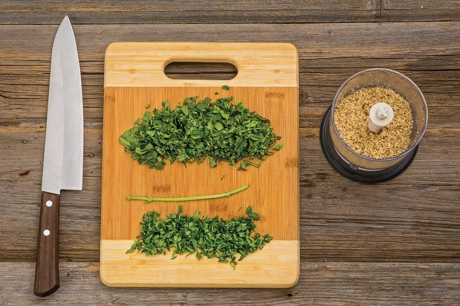 ШАГ 2 Прокрутите орехи через мясорубку или измельчите в блендере; отделите листья базилика от стеблей, нарежьте кинзу и листья базилика мелко.