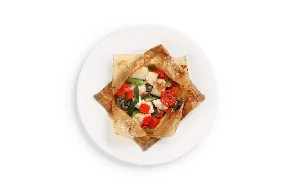 ШАГ 1 Лист плотной пекарской бумаги разрезать на четыре квадрата 20×20 см. Грудки разрезать на четыре части. Лук нарезать полосками по 5 см, помидоры — пополам. Смешать оливковое масло с солью и перцем и обвалять в нем кусочки курицы.