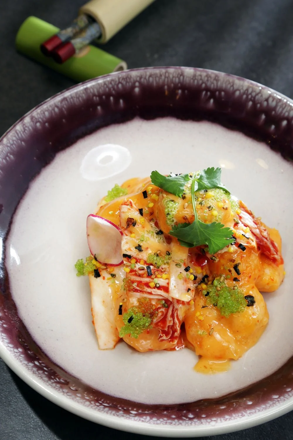 ШАГ 1 Для соуса кимчи смешать майонез, сгущенное молоко, саке, сахар, лаймовый сок, соус тобанджан, пасту кимчи — и пробить в блендере до однородности. Затянуть желатином.