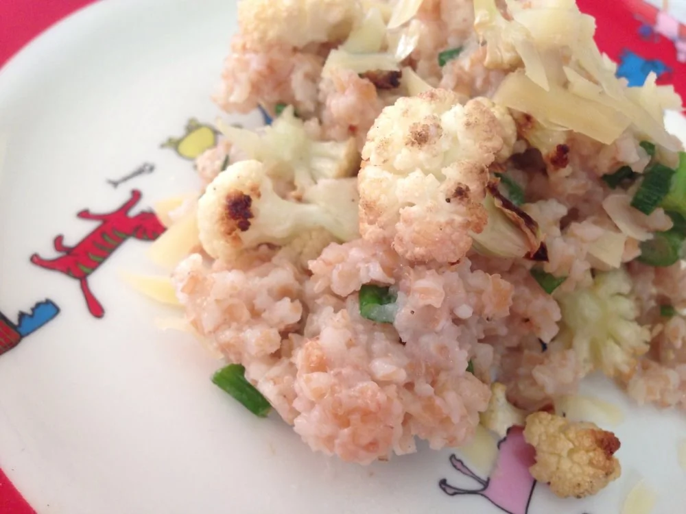 ШАГ 3 Слегка остывшую полбу перемешать с измельченным зеленым луком, лимонным соком и трюфельным маслом. В конце добавить запеченную капусту и посыпать все тертым пармезаном.
