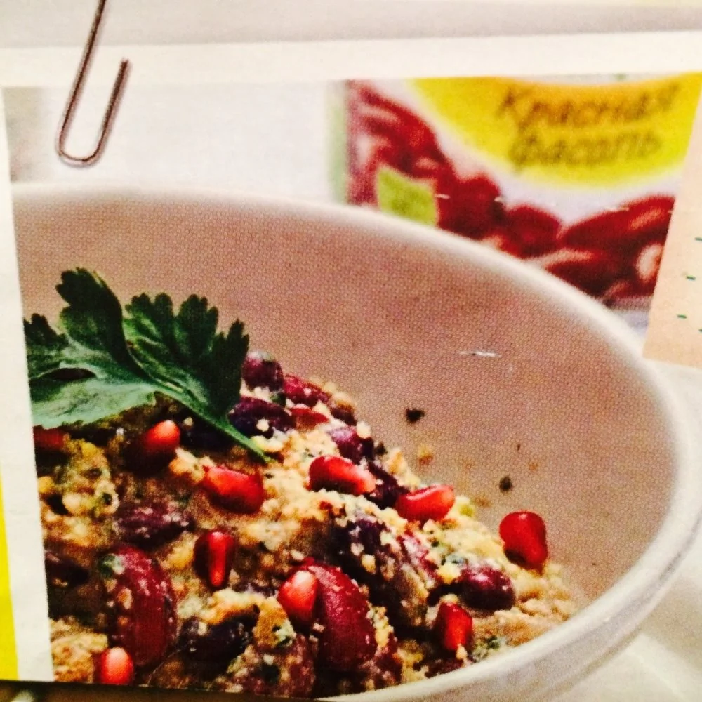 Листья кинзы (кориандра) Грецкие орехи Красная консервированная фасоль Красный лук Чеснок Петрушка Красный винный уксус Растительное масло Хмели-сунели Соль Перец черный молотый Зерна граната Закуски Грузинская кухня Лобио