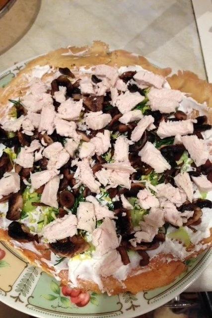ШАГ 3 Готовый «блинчик» остудить, намазать творогом, посыпать зеленью, выложить жареные грибы и мелко порезанное филе курицы; поперчить.