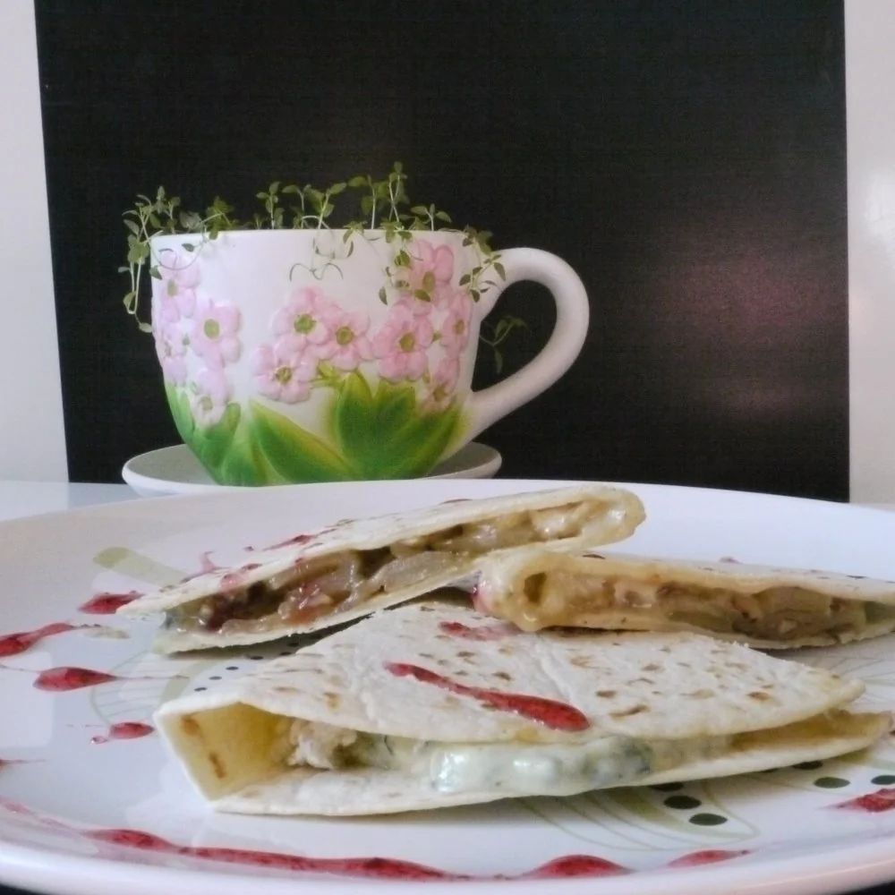 ШАГ 2 На половину тортильи положить раскрошенный сыр с голубой плесенью и несколько кусочков сыра бри. Накрыть второй половиной тортильи. Слегка прижать. Повторить с оставшимися лепешками. На сковороде гриль нагреть растительное масло. Обжарить лепешки по 2 минуты с каждой стороны или до легкого расплавления сыра. Подавать теплыми с грушевым соусом.
