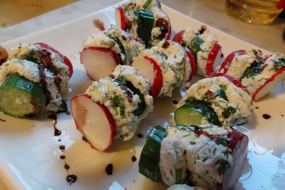 ШАГ 4 Затем нафаршировать кружок огурца творожной массой, приклеить кружок редиса; потом действо повторить — творог, огурец, творог, редис.