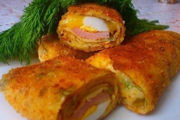 Блинчики с ветчиной, яйцами и сыром в панировке