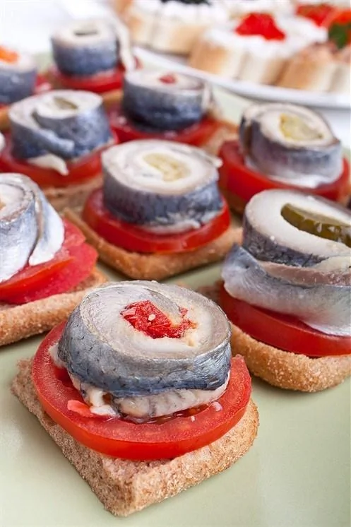ШАГ 2 На каждый кусок хлеба положить кружок помидора. Сверху положить кусочек сельди, свернутый кружком. Внутрь кружка по желанию можно положить оливку или небольшой кусочек сладкого красного перца.