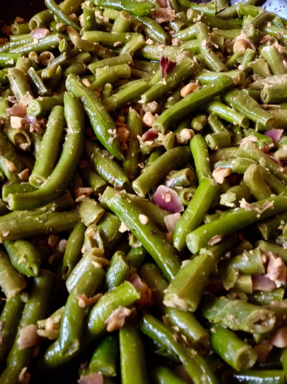 ШАГ 3 После в сковороду кладем стручковую фасоль (можно замороженную), тушим, пока фасоль не станет мягкой, добавляем грецкие орешки и выпариваем воду.