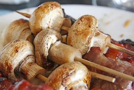 ШАГ 2 Нанизайте грибные шляпки на шпажки по очереди с кусочками бекона. Смажьте получившиеся шашлычки маслом с розмарином и готовьте под грилем, переворачивая и смазывая маслом около 15 минут, пока грибы не станут мягкими и не пропекутся. Подавайте сразу.