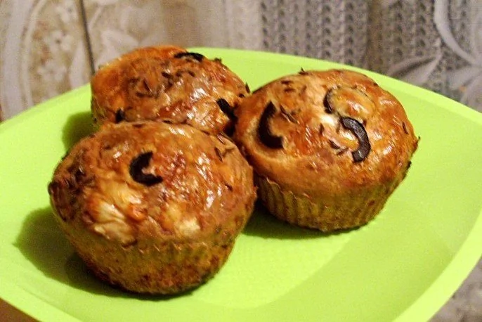 ШАГ 2 Каждую формочку заполняем так: Самый низ — чуть теста, тонкий слой сыра. Потом еще тесто, и сверху еще тонкий слой сыра. Формочка должна быть заполнена наполовину (тесто поднимется!). Сверху я посыпала тмином и украсила нарезанной маслиной.