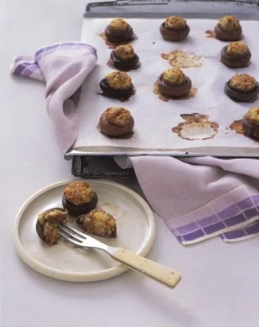 ШАГ 3 Смажьте форму для духовки маслом, уложите в нее шляпки гладкой стороной вниз, посолите и начините обжаренными ножками с луком, посыпьте хлебными крошками. Смешайте вино с бульоном и влейте в форму с грибами. Пеките 10 минут при 190 градусах и подавайте сразу в этой же посуде.