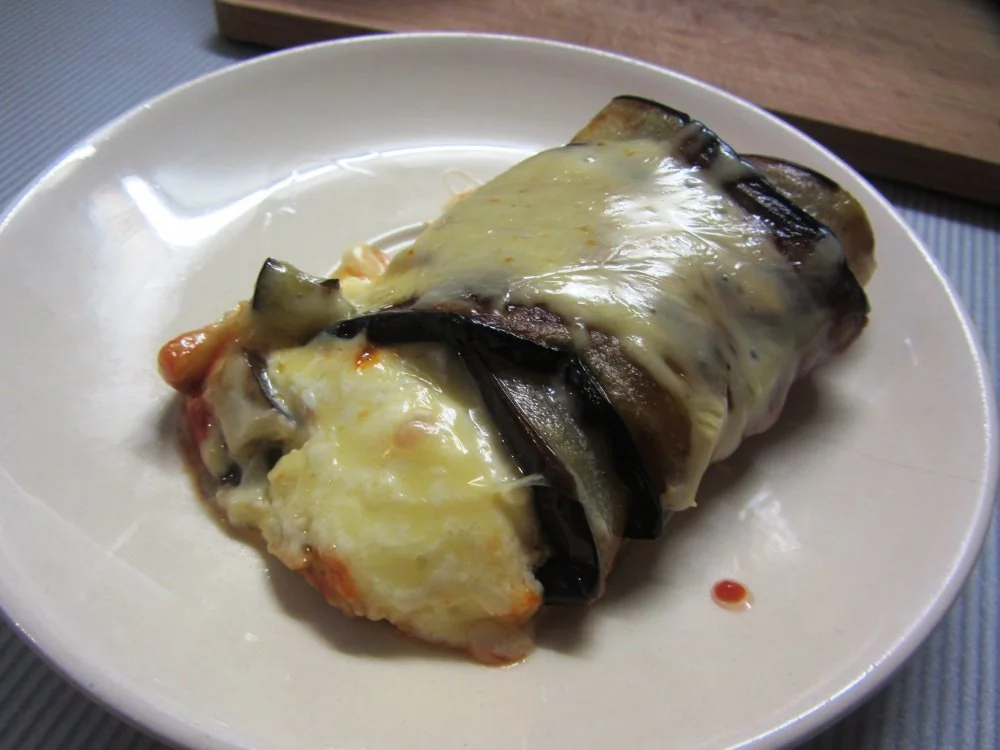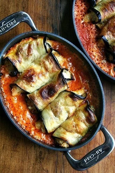 ШАГ 5 Духовку нагрейте до 210 градусов. В блюдо для запекания выложите томат-пасту тонким слоем. На один край лепестка обжаренного баклажана выложите ложку начинки, скрутите рулетик. Таким же образом скрутите остальные баклажаны.