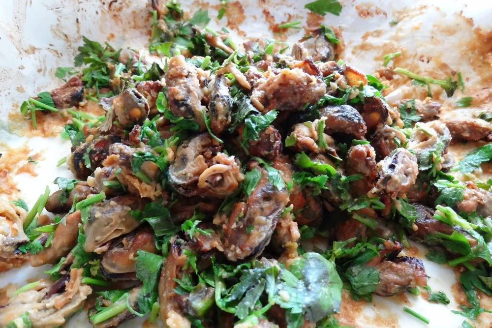 ШАГ 1 Мясо мидий перемешать с чесноком, соевым соусом, растительным маслом, искусственным дымом и панировочными сухариками (из чиабатты).