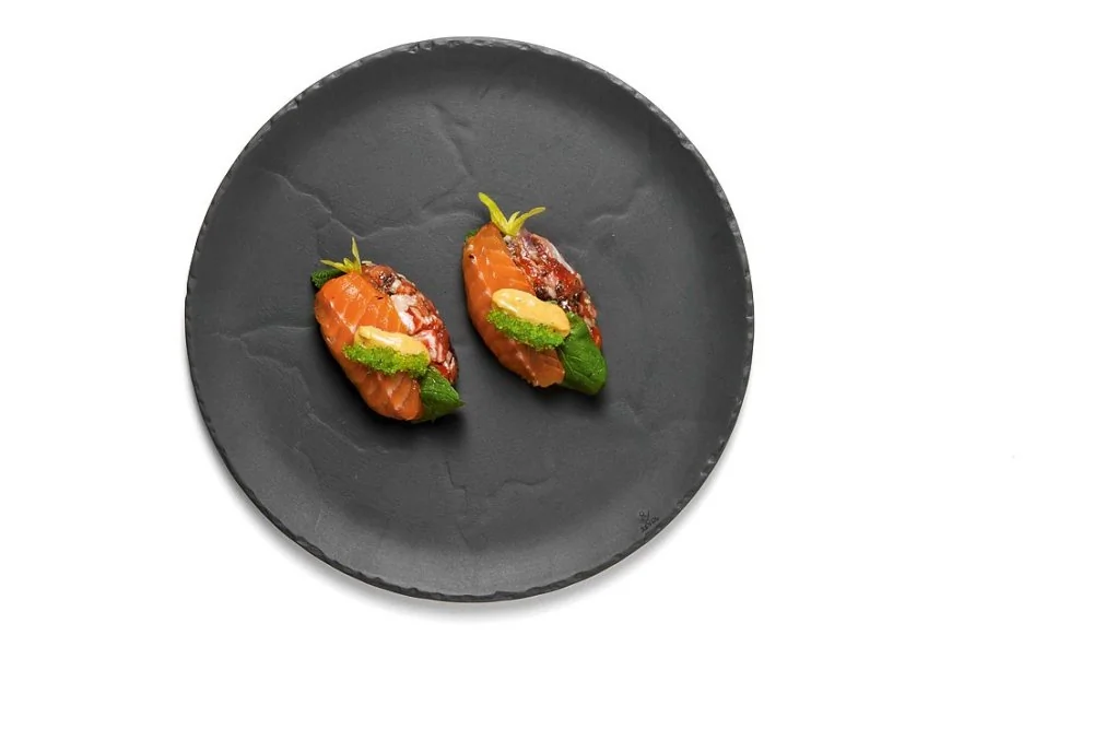 ШАГ 3 Выложить на тарелки по 2 штуки на порцию, накрыть каждую листочком мяты и ломтиком гравлакса. Капнуть сверху соевый айоли и декорировать чайной ложкой зеленой икры тобико.