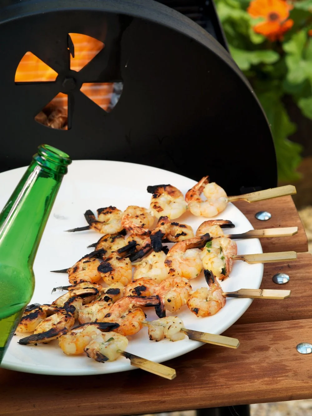 ШАГ 3 Разогреть гриль. На деревянные шампуры (их нужно предварительно на полчаса опустить в воду, чтобы они потом не сгорели) нанизать по две креветки и поджарить с двух сторон в течение трех-пяти минут до золотистого цвета. Слегка остудить и подавать.