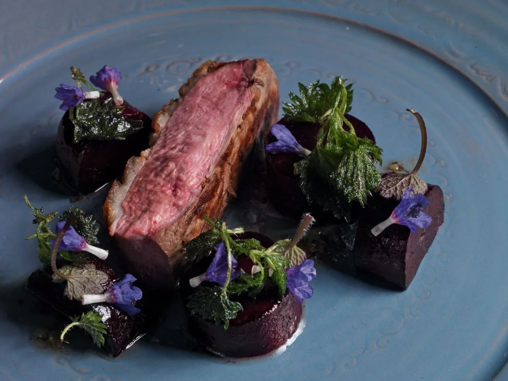 ШАГ 5 Соус налить на тарелку, выложить утку и кусочки свеклы, украсить крапивой и подавать.