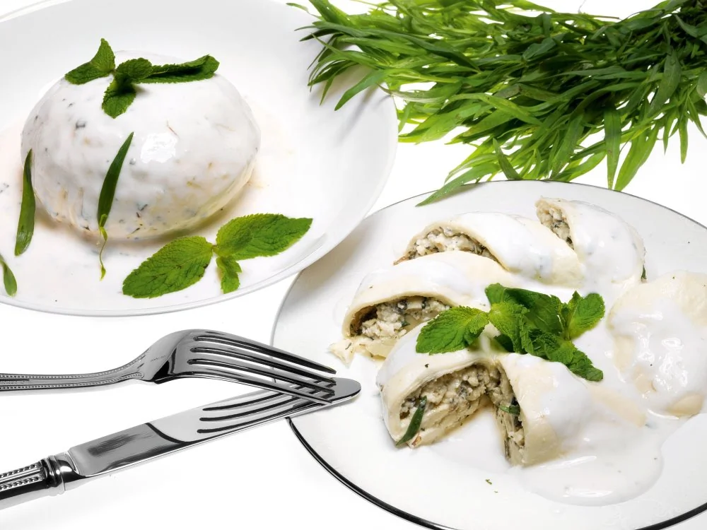 ШАГ 4 При подаче полить гебжалию мацони, смешанным с мелко нарезанными листьями мяты с оставшихся веток.
