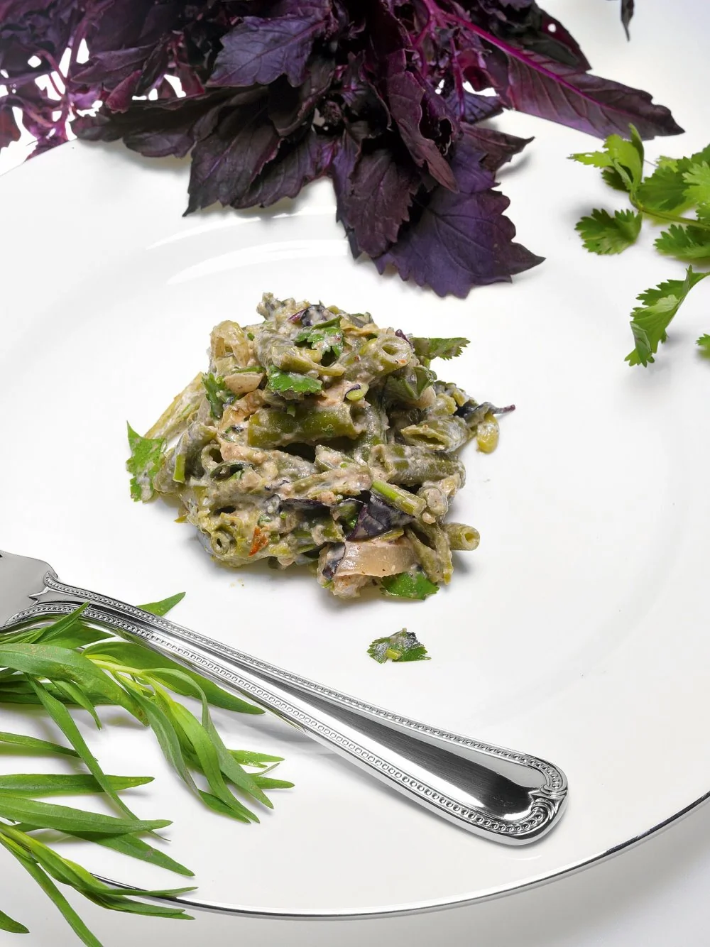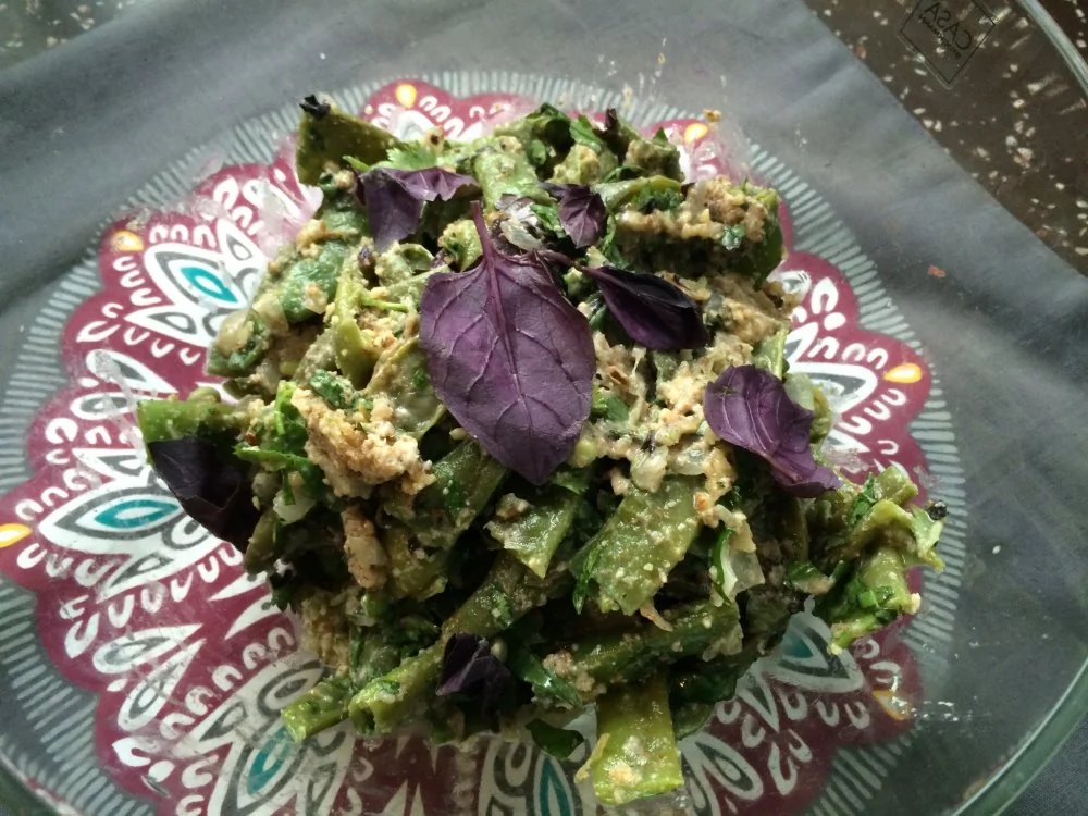 Свежая кинза (кориандр) Лук репчатый Стручковая фасоль Грецкие орехи Подсолнечное масло Сухая аджика Зеленый базилик Красный базилик Чеснок Винный уксус Соль Закуски Грузинская кухня Веганская еда Лобио
