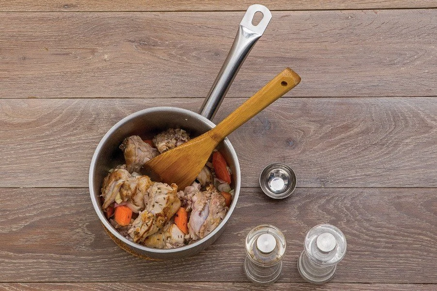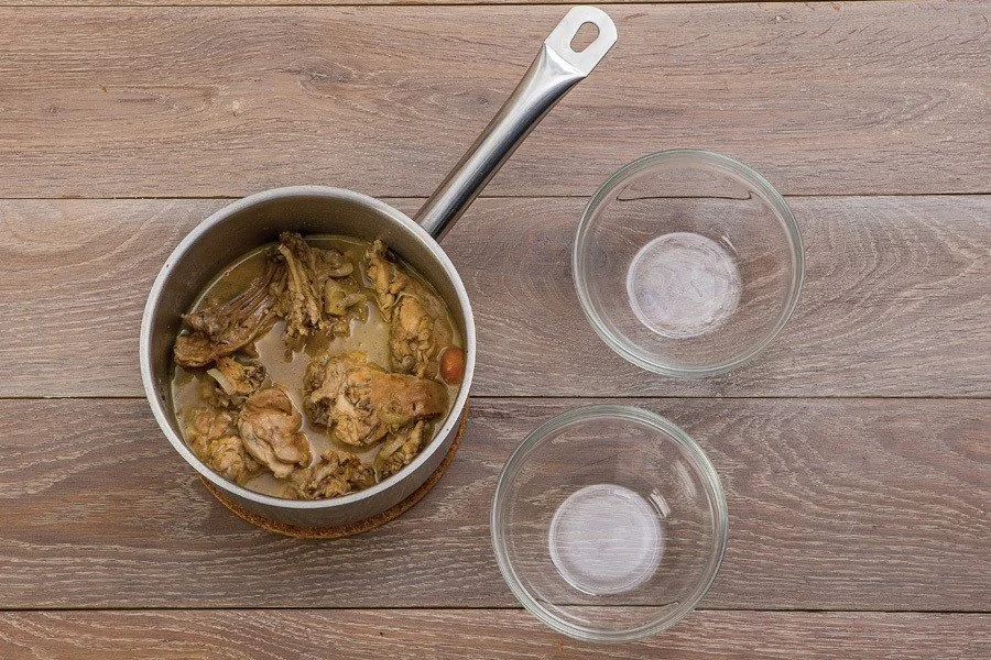 ШАГ 3 Влейте в кастрюлю 370 мл белого сухого вина, выпарите алкоголь на сильном огне в течение 5 минут; влейте бульон так, чтобы он покрывал кролика; накройте крышкой и тушите на медленном огне 90 минут.