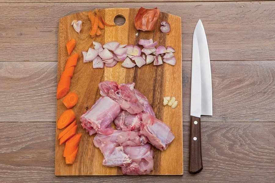 ШАГ 1 Очистите и нарежьте лук, чеснок и морковь крупными кусками, раздавите, очистите и нарежьте чеснок крупно; тушку кролика промойте, просушите бумажным полотенцем и нарежьте крупными кусками.