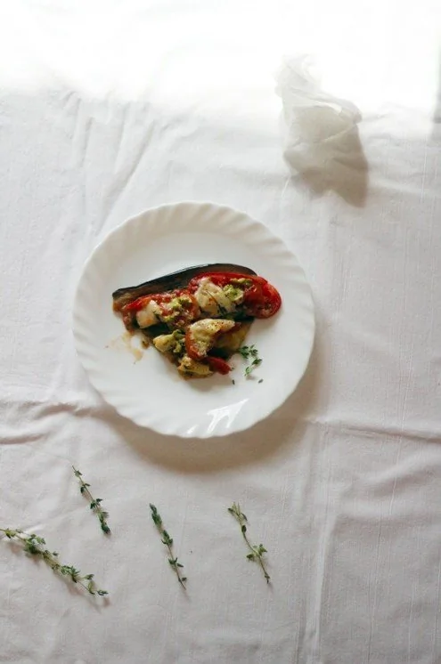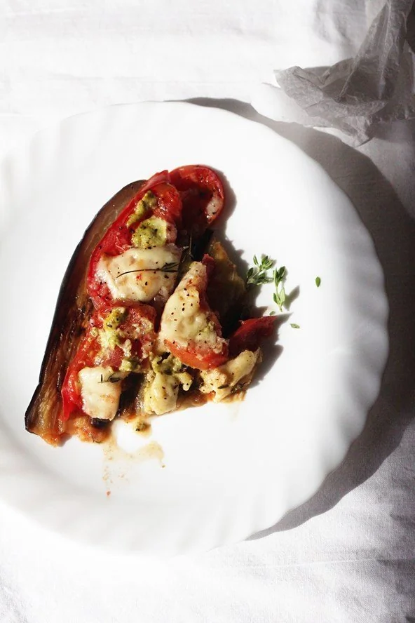 ШАГ 3 Разогреть духовку до 230 градусов. В круглую или квадратную форму, смазанную маслом, выложить пластинки баклажан, затем слой томатов, смазать тонким слоем песто, выложить слой тертого сулугуни. Повторить баклажаны-томаты-песто еще раз, сверху должен оказаться тертый сыр, слой должен быть массивнее, чем в предыдущий раз. Поперчить и поставить в духовку на 20–30 минут.