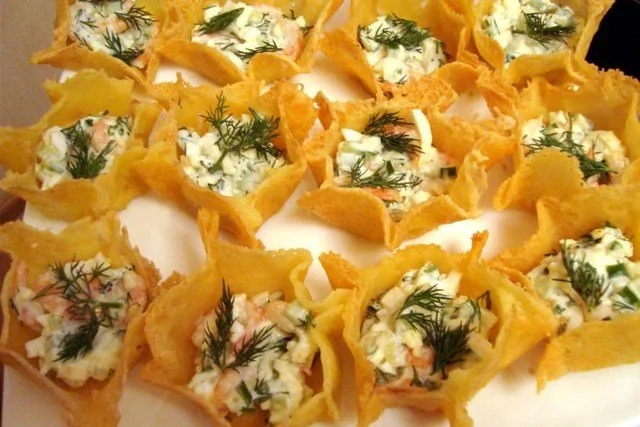 ШАГ 6 Добавить начинку в тарталетки (салат их креветок с огурцом и укропом).