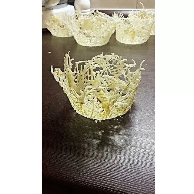 ШАГ 7 Аккуратно, но быстро, щипчиками подхватываем сыр со сковороды и кладем ее на стакан, той стороной, которая не жарилась. Руками сжимаем паутинку по форме стакана. Держим сыр на стакане, пока он не остынет и немного не затвердеет. Аккуратно снимаем, теперь уже корзинку со стенок стакана и ставим на тарелку.