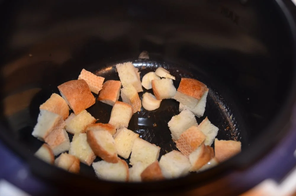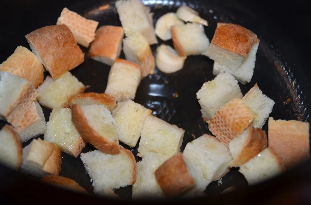 ШАГ 3 Разогреть сковороду, положить в нее сухарики и оставшиеся нарезанные зубчики чеснока, сбрызнуть оливковым маслом, поджарить до золотистой корочки.