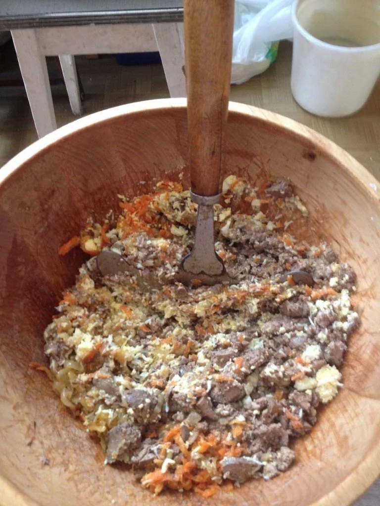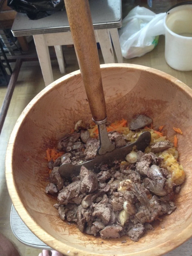 ШАГ 9 Берем сечку и с прилежанием рубим содержимое миски. Я всегда рублю паштет. Вот эти вот маленькие кусочки создают непередаваемые ощущения.