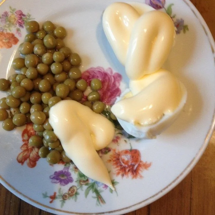 ШАГ 3 Укладываем на тарелку, желтками вверх, и аккуратно выдавливаем на желтки майонез.