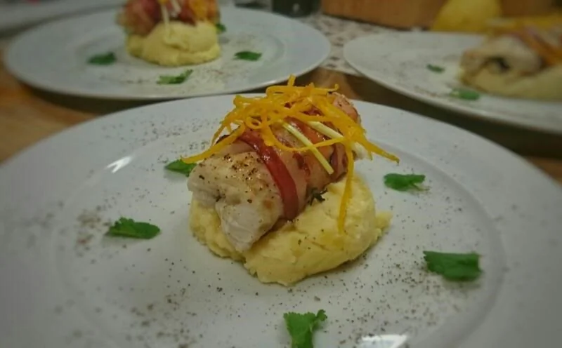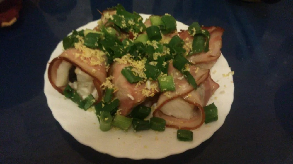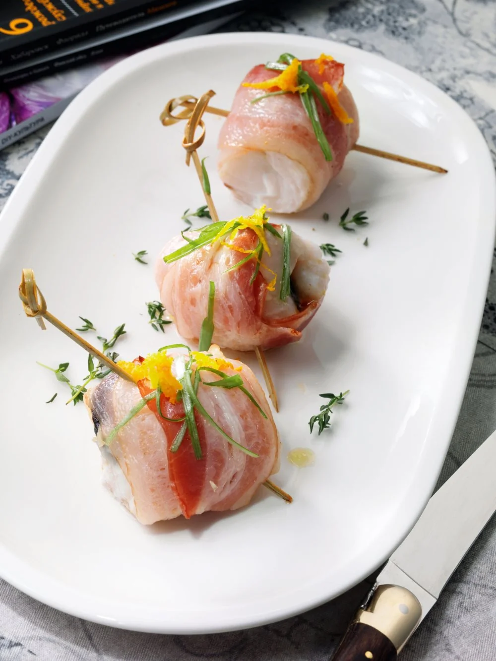 ШАГ 2 Дальше — завернуть филе в тонкие ломтики бекона (нежирного) и пришпилить бекон к рыбе шпажкой, чтобы не развернулся при запекании.