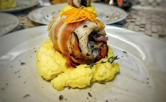 ШАГ 1 Филе трески нарезать одинаковыми кусочками размером примерно 6×6 см. Посолить, поперчить, посыпать тимьяном и завернуть в филе чернослив. Одной штуки на кусочек филе будет вполне достаточно.
