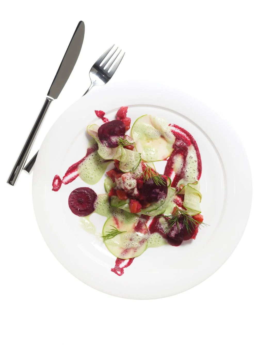 ШАГ 3 Огурец нарезать тонкими дольками. Разложить по тарелкам оставшееся свекольное пюре. Добавить дольки огурца и рыбу. Полить взбитым до пенного состояния огуречным соусом. Украсить укропом и дольками свеклы.