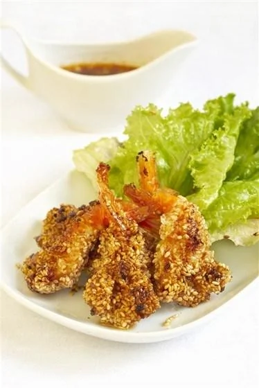 ШАГ 2 Выложить креветки на теплую тарелку, посыпать нарезанным зеленым луком и кунжутными семечками. Подавать сразу.