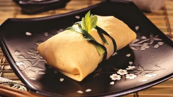 ШАГ 1 В миске слегка взбить яйца с сахаром, солью и кукурузной мукой. Разогреть в сковороде растительное масло. Влить 1/4 часть яичной массы. Жарить 30 секунд, затем перевернуть омлет на другую сторону и жарить еще 30 секунд. Переложить на блюдо. Так же приготовить еще 3 омлета. Дать им остыть.