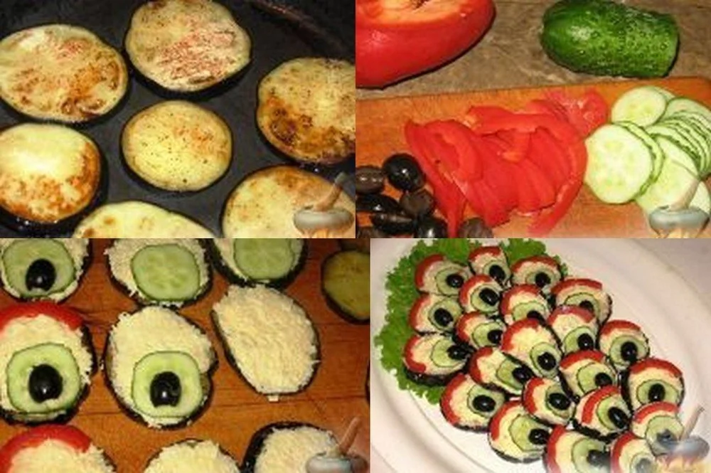 ШАГ 10 На один конец кружка выложим кружочек огурца и сверху уложим половинку маслины. Чтобы маслина держалась, я ее тоже снизу смазала салатом. На противоположный конец выкладываем по самому краю полоску перца. Так украшаем все баклажанные кружки.