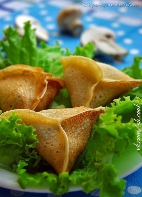 В центр блина кладём 1 ст. л. грибной начинки. Сверху сырочек. Защипываем края блинчика с одной стороны почти до середины. Потом со второй стороны и третей как на фото. Края склеиваются хорошо, главное не пересушить их на сковороде. Таким образом начиняем все блинчики. Затем складываем их на противень и в горячую духовку при 180С на 10 минут, чтобы сыр расплавился.
