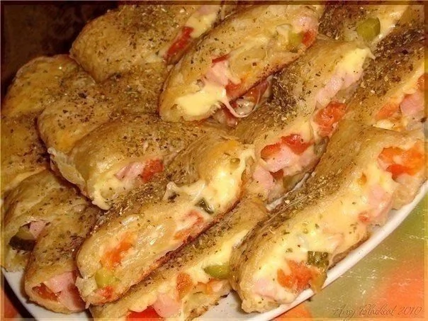 ШАГ 3 Выкладываем начинку полосой посередине теста: сначала сыр, потом все остальное и снова сыр.