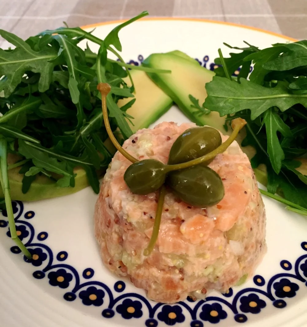 ШАГ 5 Разложить по формочкам и оставить в холодильнике на 1 час, после чего перевернуть форму на тарелку, украсить тартар каперсами, авокадо и руколой