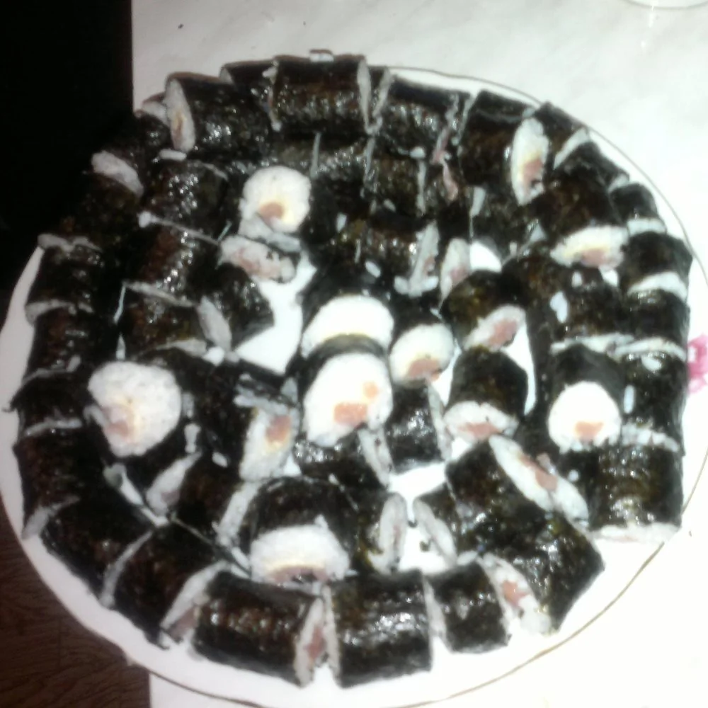 ШАГ 6 Выкладываем рис, оставляем с одной стороны 1-1,5 см. Затем кладем нашу рыбку.