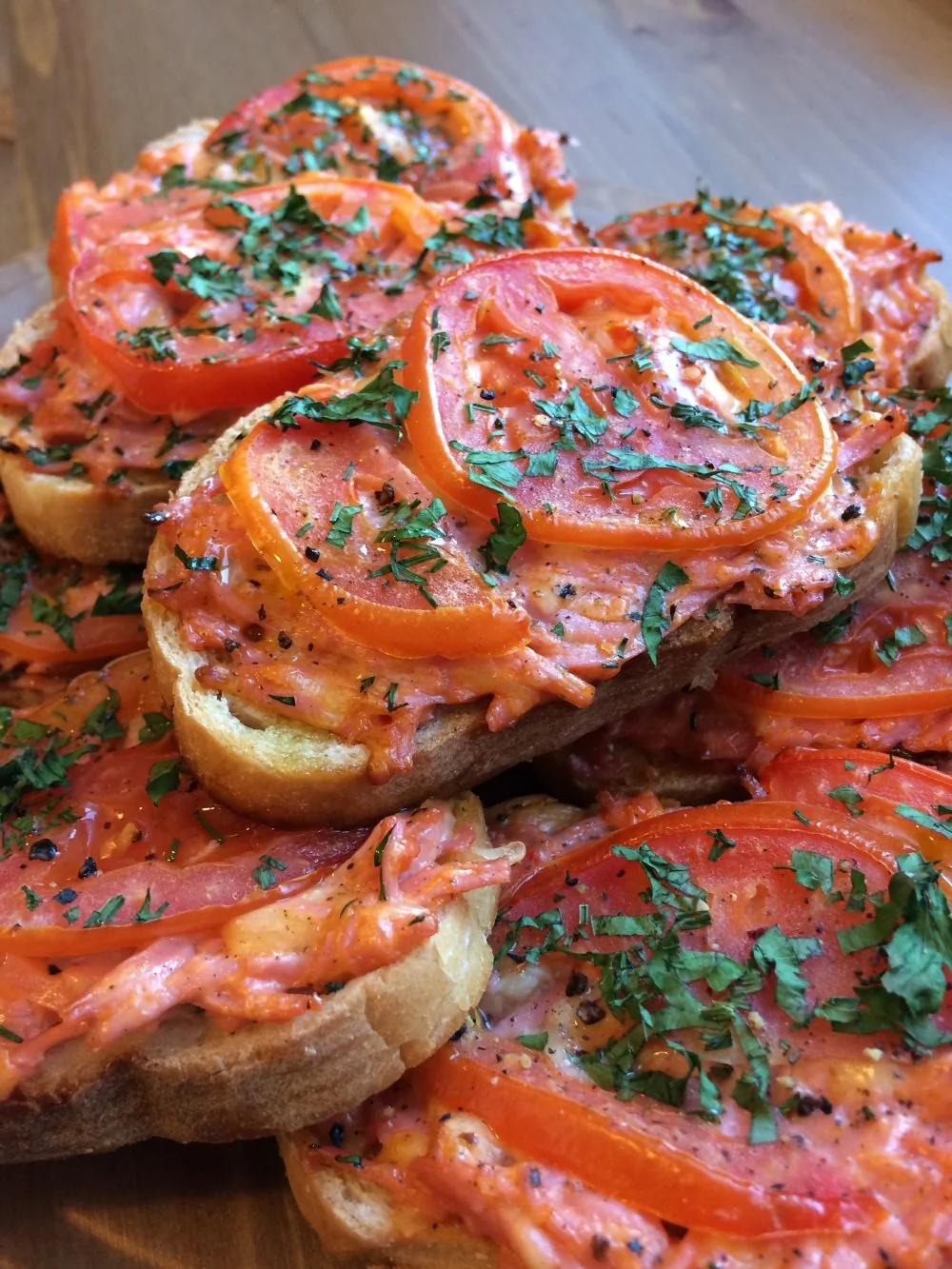 ШАГ 5 Выкладываем полученную массу на нарезанные кусочки батона, сверху кладем по кусочку помидора.