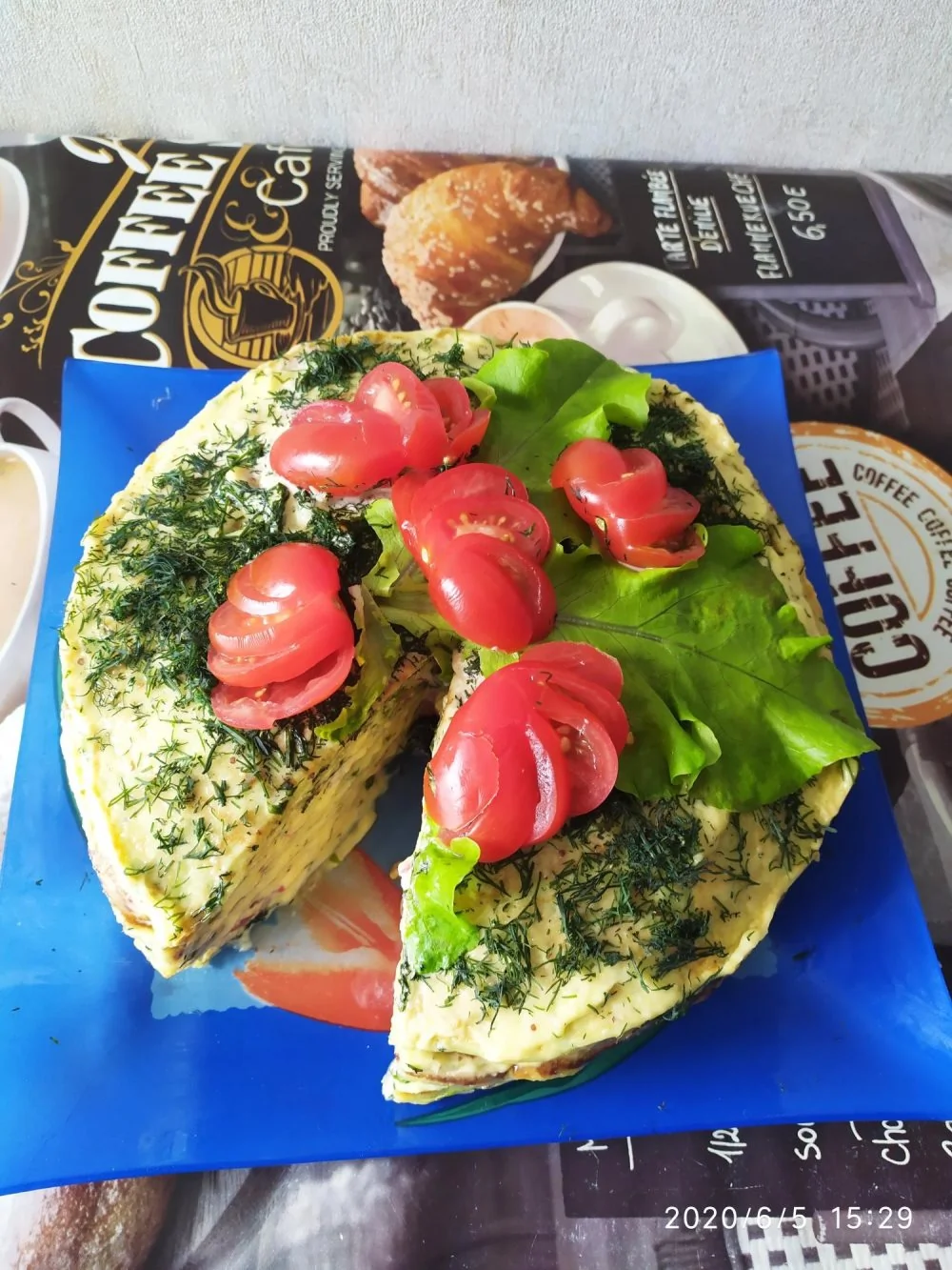 ШАГ 7 После этого даем торту остыть и украшаем его на свой вкус. Например помидорами и зеленью. Кушать лучше остывший торт, он плотнее и вкуснее.