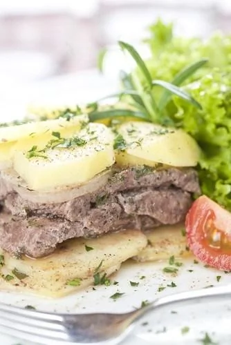 ШАГ 2 Выложить все ингредиенты в глубокую сковороду или форму с высокими бортиками, предварительно смазав дно растительным маслом. Порядок выкладывания следующий: половина картошки, половина лука, мясо, оставшийся лук, картошка. Каждый слой сверху нужно посолить.