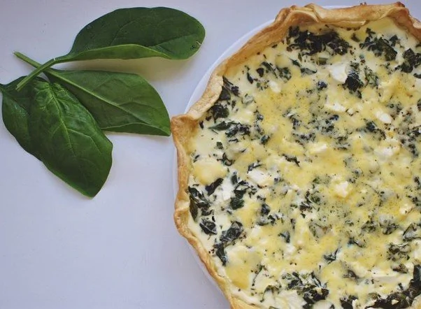 Поставить в духовку (180градусов) на 5-7 минут что бы тесто чуть «схватилось». Тем временем нарезанный шпинат чуть притомить на сковородке без соли. Добавить Фету. Перемешать.